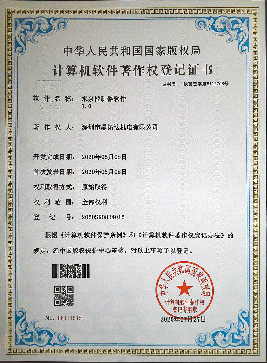 水泵控制器軟件證書