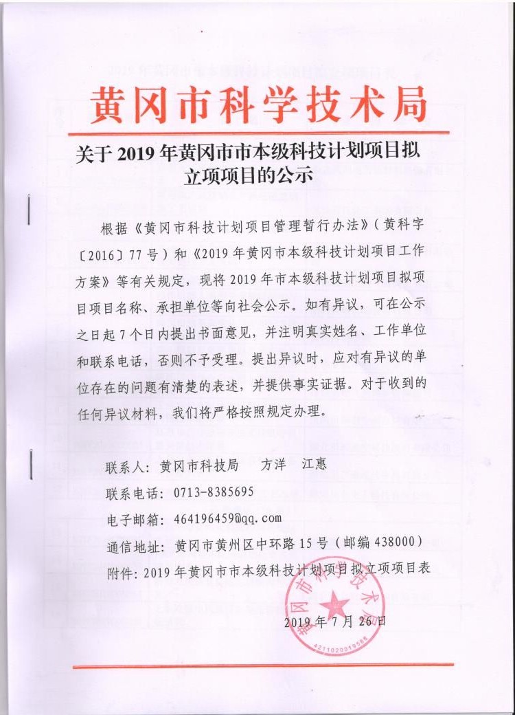 關于2019年黃岡市市本級科技計劃項目擬立項項目的公示