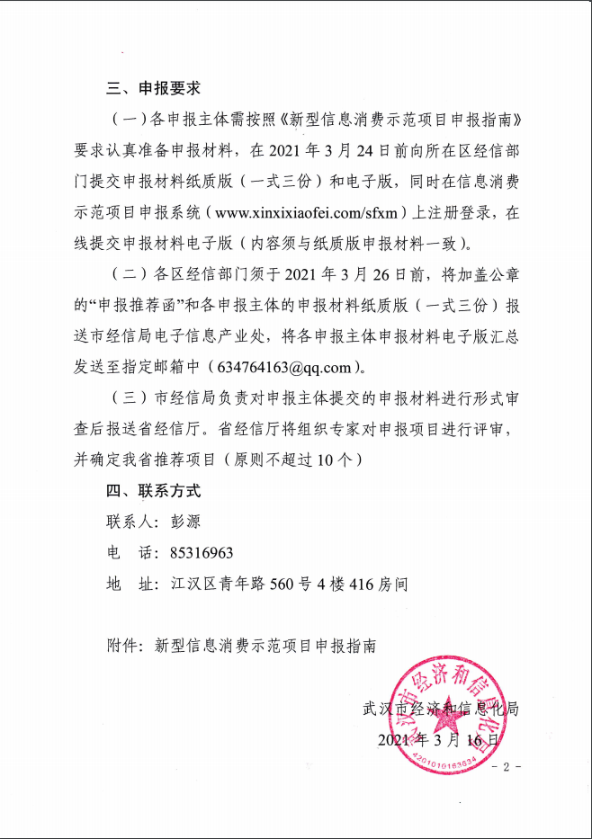 各申報企業需按照《新型信息消費示范項目申報指南》要求認真準備申報材料,在2021年32317:00之前提交申報材料紙質版(一式三份)至東湖高新區政務中心7號樓7016word電子版PDF蓋章版一并打包發送至郵箱1930171438@qq.com,同時在信息消費示范項目申報系統(www.xinxixiaofei.com/sfxm)上注冊登錄,在線提交申報材料電子版(內容須與紙質版申報材料一致)。